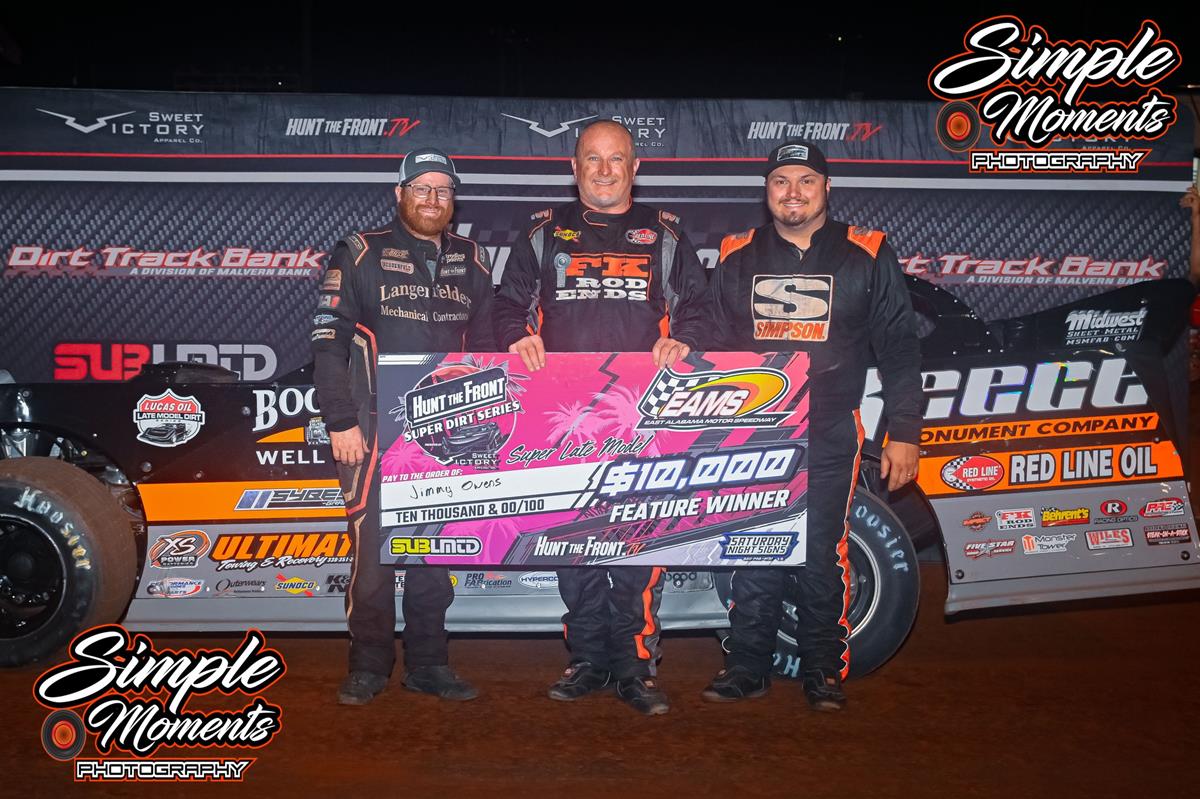 PHENIX CITY, Ala. (August 19) — Leading every lap in his second-career series start, Jimmy Owens of Newport, TN controlled the night's 50-lap Hunt the Front Super Dirt Series feature